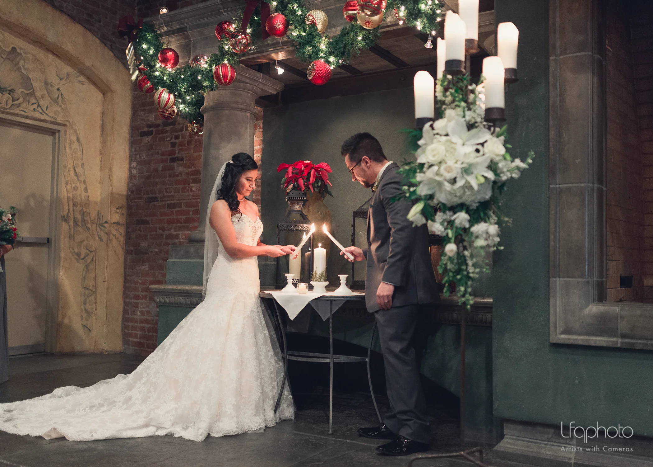 After a night heavy with rain, the sky cleared up to a slightly misty morning. The castle-like grounds of The River Mill in French Camp, California transported us to another time, somewhere in Middle-Earth. It was perfect for an intimate gathering with just a hint of adventure...Meanwhile, from a stairwell, the Bride and her maidens enrobed themselves in velvet cloaks and swiftly made their passage to an old tavern by the light of the mystical lanterns they were carrying (each brimming with beautiful greenery and flowers). At the tavern, each maiden was met by warrior (from a galaxy far, far away), who led them into a great hall with a magnificent fireplace. They each took their places in the great hall alongside the King who was awaiting his true love...